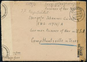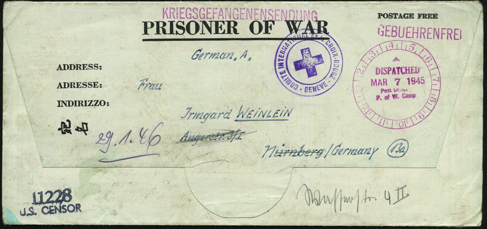 2809 | 35 € | KGF-POST II. WELTKRIEG (ab 1939) : U.S.A. / DEUTSCHES REICH 1945 (7.3.) viol. Zifferblatt-2K: DISPATCHED../Post Office/P. of W. Camp + 1L: GEBUEHRENFREI +1L: KRIEGSGEFANGENENSENDUNG + schw. Zensur-2L: 11228//U.S. CENSOR +rs. hs. Abs.: P.O. Camp Douglas.., Kgf.-Zensur-Bf. mit Inhalt n. Nürnberg = "stummer Überrroller" via I.R.K. Genf, viol. Rotekreuz-2K.!, zugestellt am 29.1.46 selten! (siehe A. Meschenmoser!) | ![]() ![]() | |
