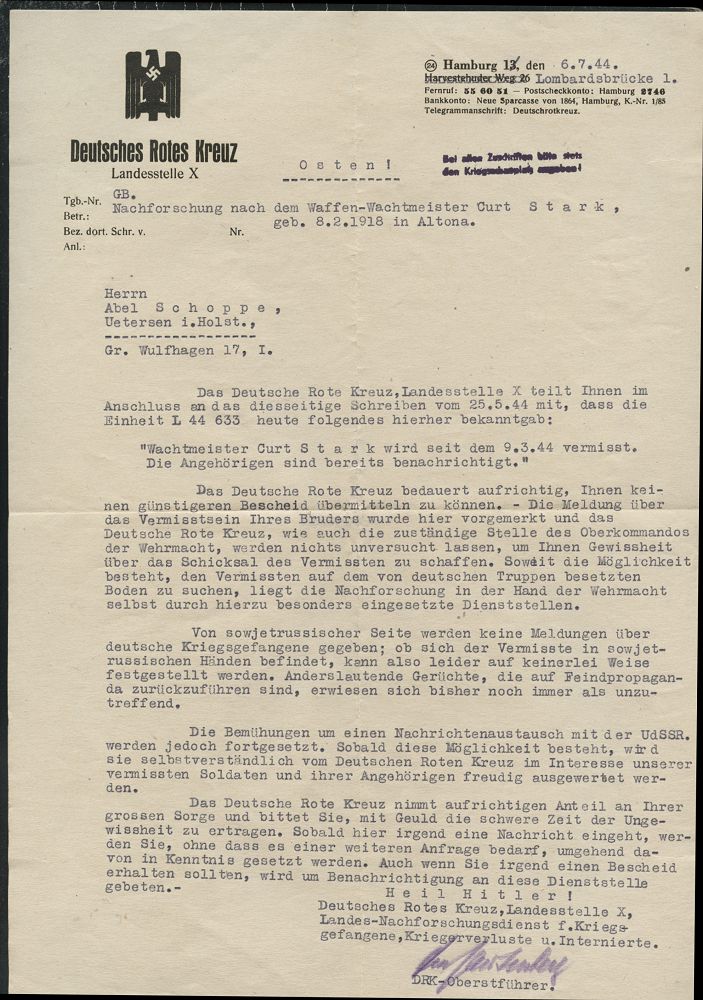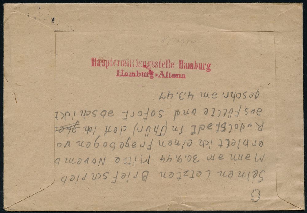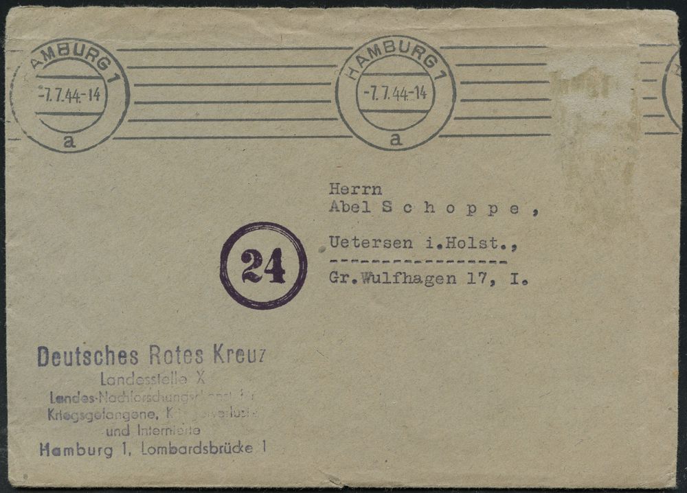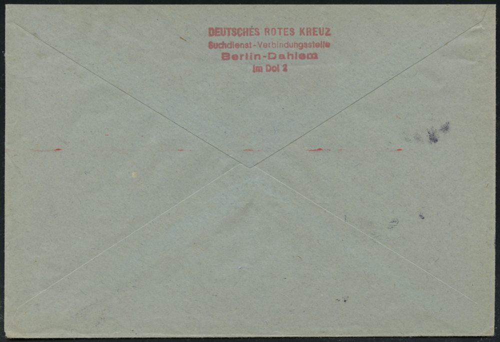 2739 | 35 € | KGF-POST II. WELTKRIEG (ab 1939) : HAMBURG 1/ a 1944 (7.7.) Band-MaSt., Frankatur abgelöst, da portofrei!, Dienst-Bf.: Deutsches Rotes Kreuz, Landesstelle X, Landes-Nachforschungsstelle für Kriegsgefangenen, Kriegerverluste u. Internierte.. mit entspr. viol.Abs.-6L, portofreier Inl.-Dienst-Bf. + Inhalt: DRK-Briefbogen u. Stellungnahme zum vermissten Luftwaffen-Soldaten Fp.-Nr. 44 633 = Stab, schw. Flak-Abt. 251, Ostfront, 2 Belege kompl. = selten! n. Uetersen | ![]() ![]() | |