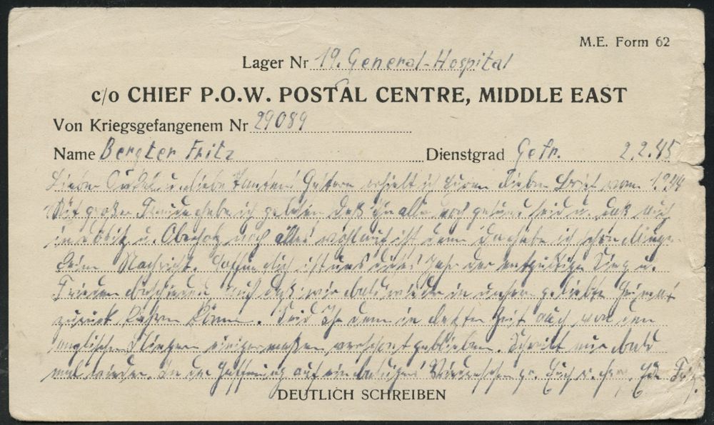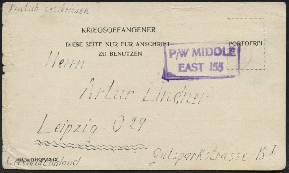 2757 | 18 € | KGF-POST II. WELTKRIEG (ab 1939) : ÄGYPTEN / D.A.K. 1945 (2.2.) Kriegsgef.-Formblatt: CHIED P.O.W. POSTAL CENTRE. MIDDLE EAST (M.E. Form 62) + viol. Ra2: P/W MIDDLE/EAST 155 = Kgf.-Lager in Ägypten für D.A.K.-Kgf. (links Randmäng.) Kgf.-Karte n. Leipzig | ![]() ![]() | |