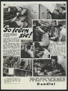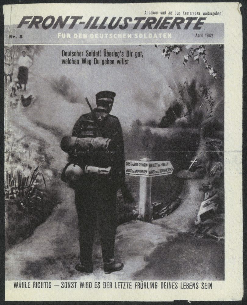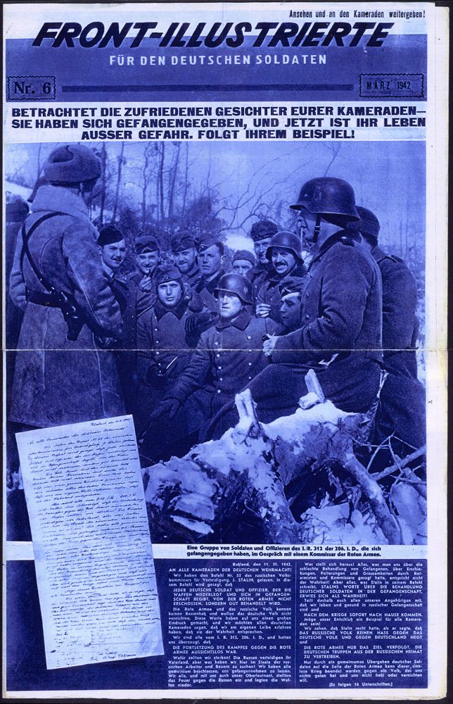 2781 | 25 € | KGF-POST II. WELTKRIEG (ab 1939) : UdSSR / DEUTSCHES REICH 1942 (Apr.) sowjet., deutschsprachige Propaganda-Flugblatt-Zeitung: "FRONT-ILLUSTRIERTE" Nr.8 "Ansehen und..weitergeben!" ,Großformat (23 x 29 cm, gefaltet, Gebrauchsspuren u. Riß) 4 Seiten, Titel-Fotomontage: Deutscher Soldat! Überlegs Dir gut.. (Soldat am Scheideweg) rs. Pieck agitierend, sehr selten! | ![]() ![]() | |