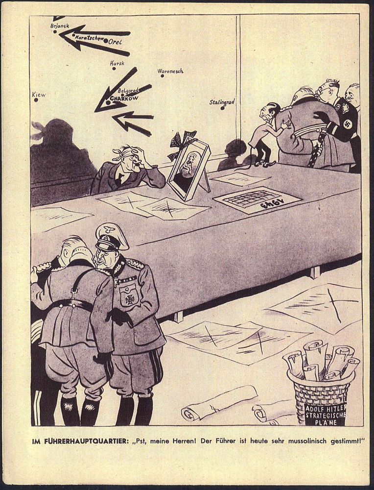 2795 | 35 € | KGF-POST II. WELTKRIEG (ab 1939) : UdSSR / DEUTSCHES REICH 1943 (Aug.) sowjet., deutschsprachige Propaganda-Flugblatt-Zeitung: FRONT-ILLUSTRIERTE FÜR DEN DEUTSCHEN SOLDATEN Nr. 23 (67) , 4 Seiten, vs. Mussolinis Sturz, rs. entspr. Karikatur Hitler, Goebbels, Keitel , innen Bericht über Italien etc. (Format 22 x 29 cm) fast druckfrische Erhaltung!, sehr selten! | ![]() ![]() | |