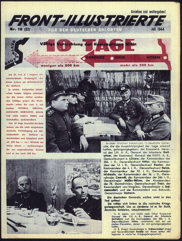 2801 | 35 € | KGF-POST II. WELTKRIEG (ab 1939) : UdSSR / DEUTSCHES REICH 1944 (Juli) sowjet., deutschsprachige Propaganda-Flugblatt-Zeitung: FRONT-ILLUSTRIERTE Nr.10, Sonderausgabe Vernichtung der Heeresgruppe Mitte (gefangene Generäle u. Mannschaften) 4 Seiten (Format 21,5 x 29 cm) gute Erhaltung!, sehr selten! | ![]() ![]() | |