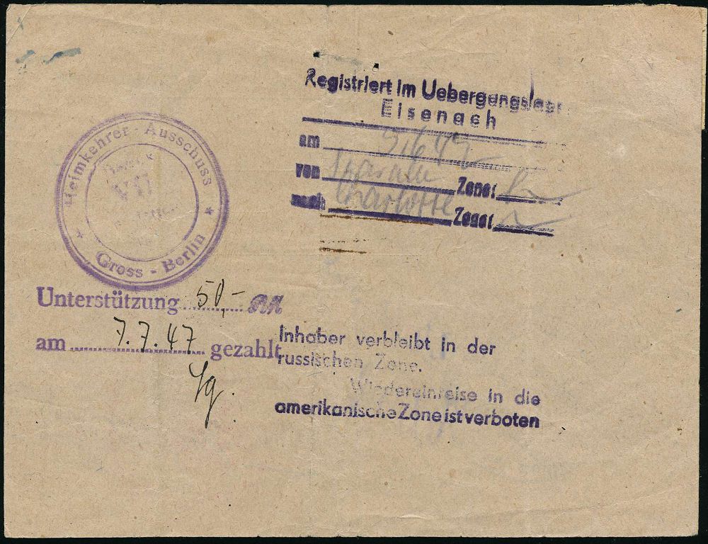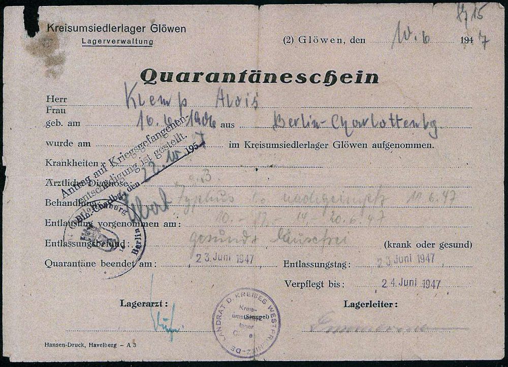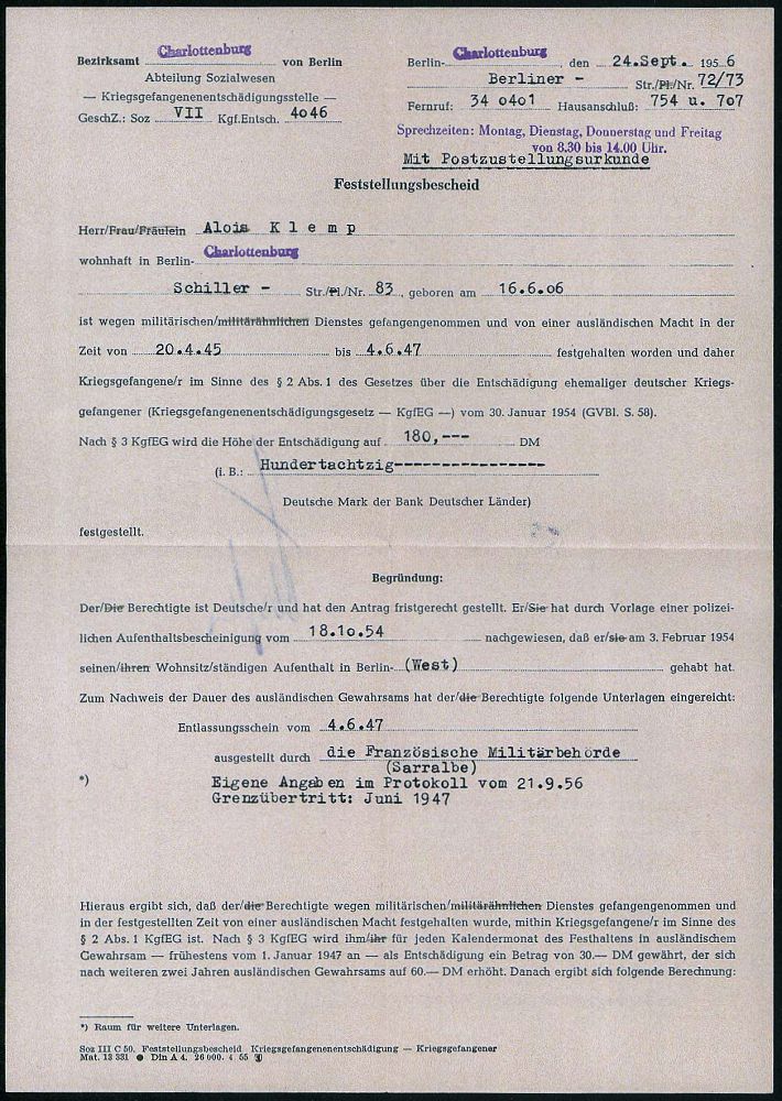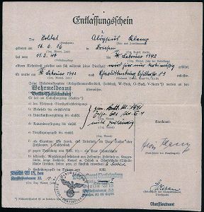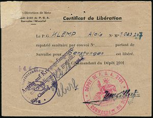 2752 | 50 € | KGF-POST II. WELTKRIEG (ab 1939) : DEUTSches reich 7 französ.ZONE 1942/56 Dokumentation eines deutschen Kgf. in französ. Kgf.-Schaft: Entlassungsschein Wehrmeldeamt Berlin (1942), , 2 französ. Repatriierungs-Doumente, 1 frz. Enlassungsschein, 2 Quarantänescheine Umsiedlerlager Glöwen (1x kyrill.-dt.) u. 1 Kgf.-Anerkennungs-Dokument Berlin-West (1956) 2 Belege Mäng. sonst gute Erhaltung, 7 Dokumente! | ![]() ![]() ![]() ![]() ![]() ![]() | |
