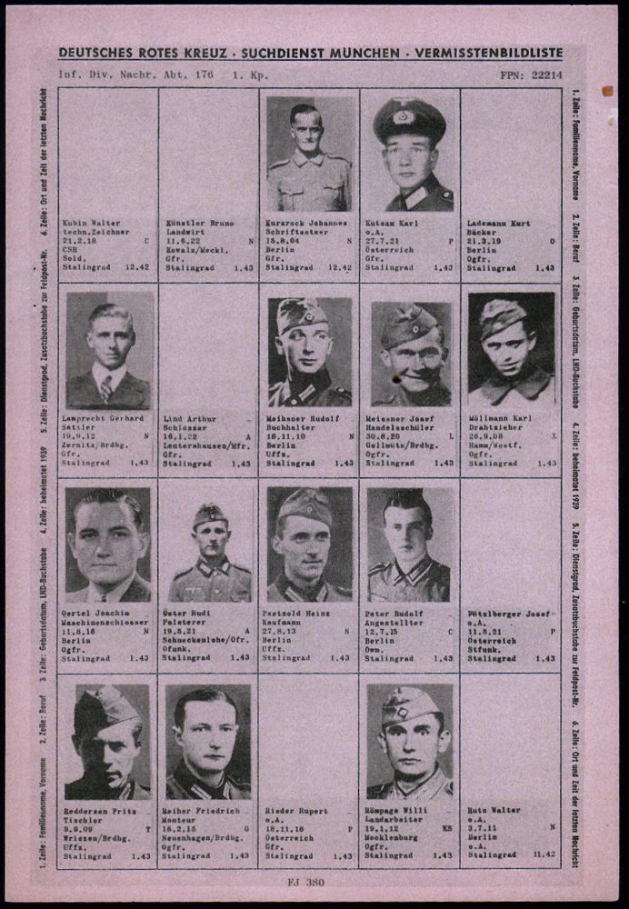 2754 | 25 € | KGF-POST II. WELTKRIEG (ab 1939) : B.R.D. 1949 (ca.) S t a l i n g r a d - Vermißtenliste des DRK (Suchdienst München) mit Namen u. Fotos der Vermißten (rs. Hinweise zur Handhabung) selten! (Format A4, Formblatt FJ 380) | ![]() | |