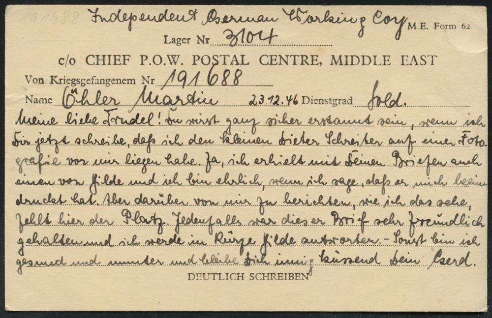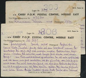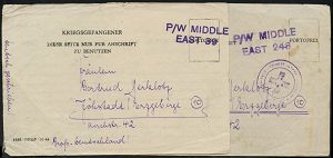 2758 | 35 € | KGF-POST II. WELTKRIEG (ab 1939) : ÄGYPTEN / D.A.K. 1945/46 3 verschied. Kgf.-Kt. vom: CHIEF P.O.W. POSTAL CENTRE MIDDLE EAST (Lager 3104 bzw. 306) 2x viol. 2L: P-W MIDDLE/EAST 248 vom 14.3.1945 (fleckig) bzw. P-W MIDDLE/EAST 39, 3 Belege einer Korrespondenz eines Afrika-Korps-Kgf.. n. Jöhstedt! | ![]() ![]() ![]() | |