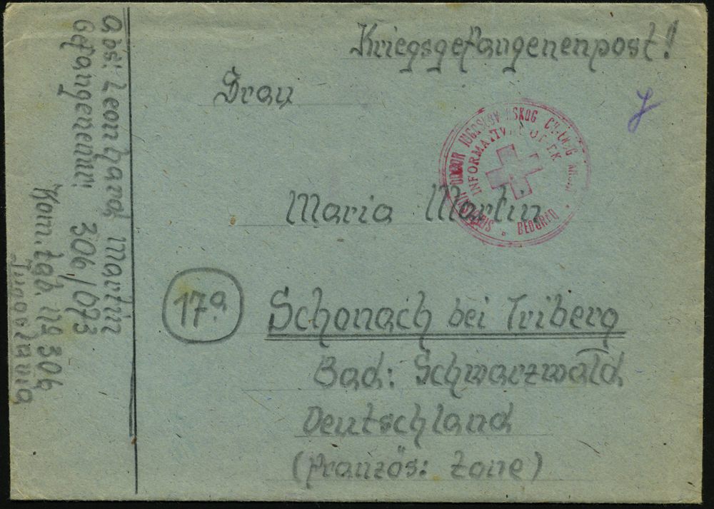 2772 | 18 € | KGF-POST II. WELTKRIEG (ab 1939) : JUGOSLAWIEN 1946 (28.7.) roter Rotkreuz-2K: BEOGRAD + hs. Abs.: "Kom. tgb. No. 306" + Inhalt = deutscher Kgf. in Jugoslawien! n. Schonach, 2 Belege kompl.! | ![]() | |