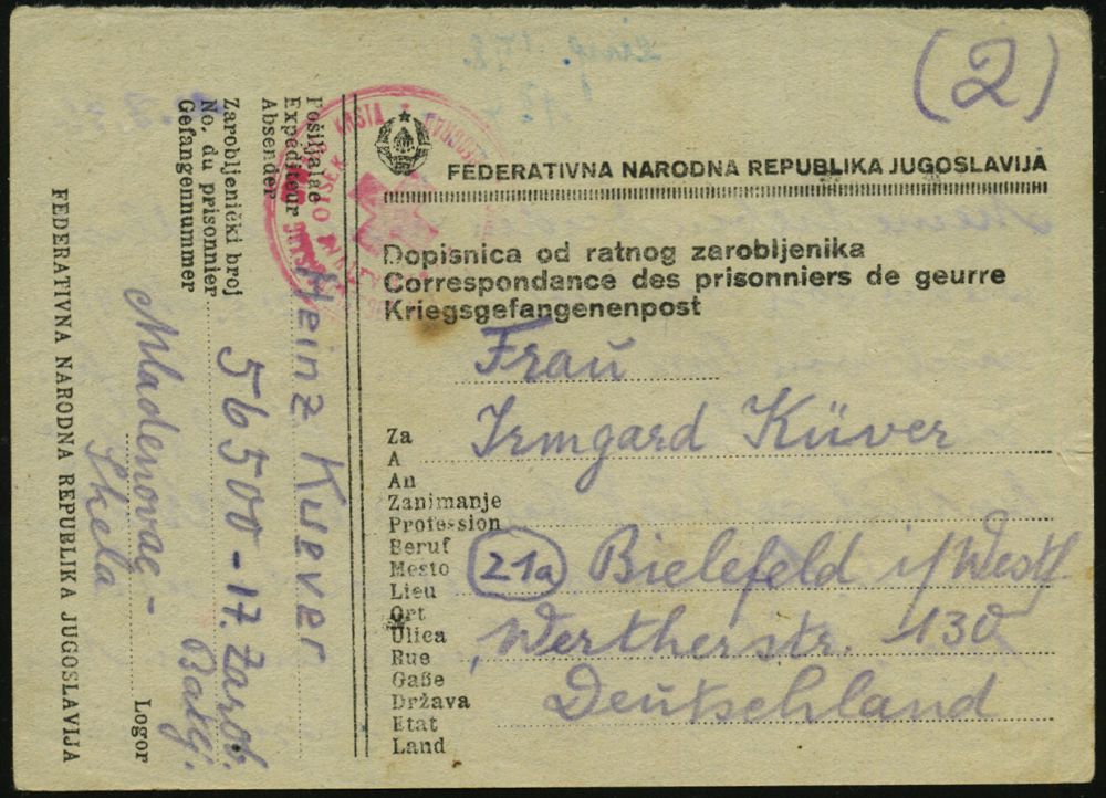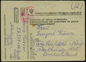 2773 | 16 € | KGF-POST II. WELTKRIEG (ab 1939) : JUGOSLAWIEN 1946 (12.8.) Kgf.-Vordruck-Kt.: FED.NARODNA REPUBLIKA JUGOSLAVIJA.. (Staatswappen) + roter Rotkreuz-HdN (nicht ganz voll) deutscher Kgf. im Lager: Mladenovae-Skela n. Bielefeld | ![]() ![]() | |