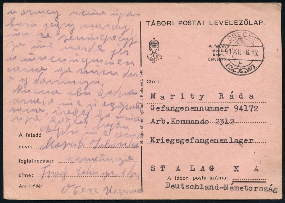 2775 | 20 € | KGF-POST II. WELTKRIEG (ab 1939) : UNGARN 1941 (6.12.) 1K-Brücke: OBECSE mit Ziermuster auf portofreier Kgf.-Karte (rs. kl. Haftspuren) an Arbeits-Kdo 2312, Stalag X A = Stammlager Schleswig (Wo.43) o h n e Zensur! in ungar. Sprache | ![]() | |