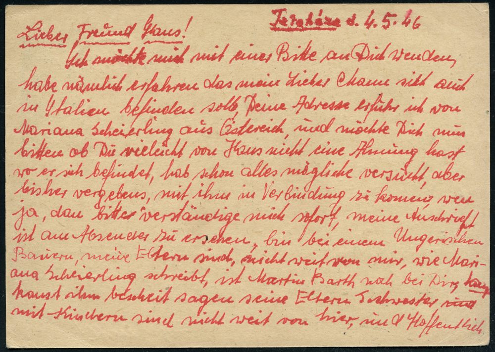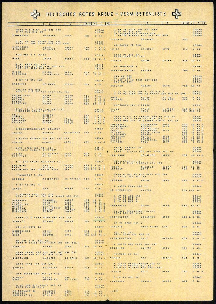 2751 | 20 € | KGF-POST II. WELTKRIEG (ab 1939) : DEUTSCHES REICH 1945 (Apr.) Vermisstenliste des Deutschen Roten Kreuzes von Heer, Luftwaffe u. Marine (auch U-Boote!) etc. (gefaltet) mit Vermissten von 1943-1945, sehr später Beleg! (Format A4) | ![]() | |