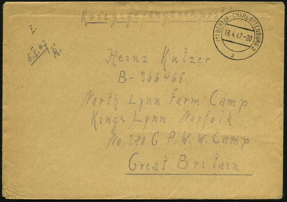 2732 | 14 € | KGF-POST II. WELTKRIEG (ab 1939) : (1) BERLIN-CHARLOTTENBURG 2/ z 1947 (18.4.) 2K-Steg auf portofreiem Kgf.-Bf. an britisches P.O.W.-Camp No. 280, North Lynn Farm Camp (Norfolk) an deutschen Kgf. + Inhalt, 2 Belege kompl. | ![]() | |