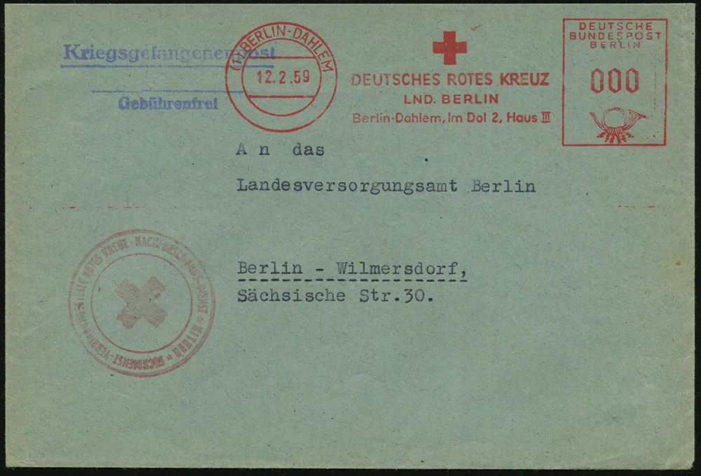 2735 | 15 € | KGF-POST II. WELTKRIEG (ab 1939) : (1) BERLIN-DAHLEM/ DEUTSCHES ROTES KREUZ/ LND.BERLIN.. 1959 (12.2.) AFS Francotyp in 000 + 2L: Kriegsgefangenenpost/ Gebührenfrei + roter Abs.-2K: SUCHDIENST..RK NACHFORSCHUNGS-DIENST (RK) klar gest. portofreier Orts-Bf. (Dü.E-24CG) | ![]() ![]() | |