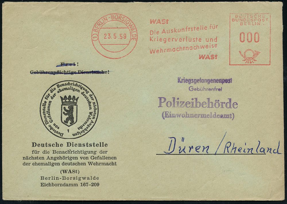 2736 | 16 € | KGF-POST II. WELTKRIEG (ab 1939) : (1) BERLIN-BORSIGWALDE/ WASt/ Die Auskunftsstelle für/ Kriegerverluste.. 1959 (23.5.) AFS Francotyp in 000 = gebührenfrei + viol. 2L: Kriegsgefangenenpost/Gebührenfrei , Dienst-Bf.: Deutsche Dienststelle.. Borsigwalde klar gest. n. Düren (Dü.E-23CO) | ![]() | |