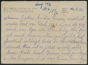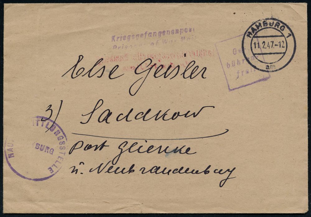 2740 | 25 € | KGF-POST II. WELTKRIEG (ab 1939) : HAMBURG 1/ am 1947 (11.2.) 2K-Steg + viol. 2L: Kriegsgefangenensendung/ Prisoner of War Mail + rs. roter 2L: Hauptermittlungsstelle Hamburg/ Hamburg-Altona (+ rs. hs. Kommentar) + viol. Ra.3: Ge./bühren-/frei in die SBZ n. Neubrandenburg, seltener Beleg! | ![]() ![]() | |