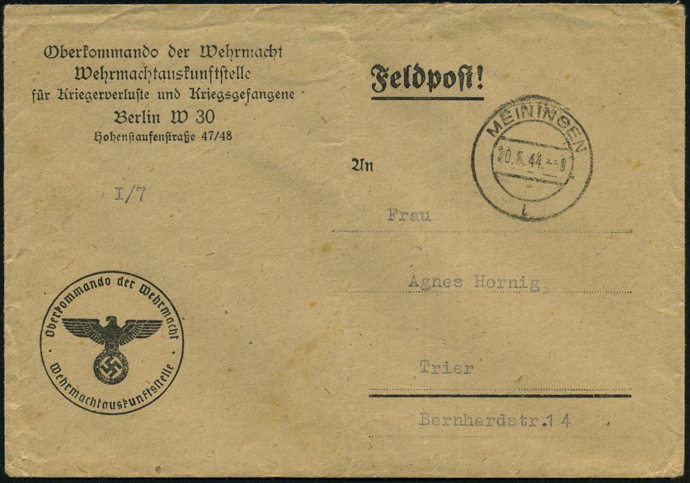 2742 | 20 € | KGF-POST II. WELTKRIEG (ab 1939) : MEININGEN/ l 1944 (20.5.) 2K-Steg auf Dienst-Bf.: Oberkommando der Wehrmacht/ Wehrmachtsauskunftsstelle für Krieger-verluste.. Berlin 30 = kriegsbedingt a u s g e l a g e r t e WASt. wegen Bombenkrieg! (Bf. schwache Mittelfalte) seltener Feldpost-Bf. n. Trier | ![]() | |