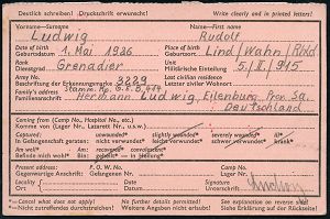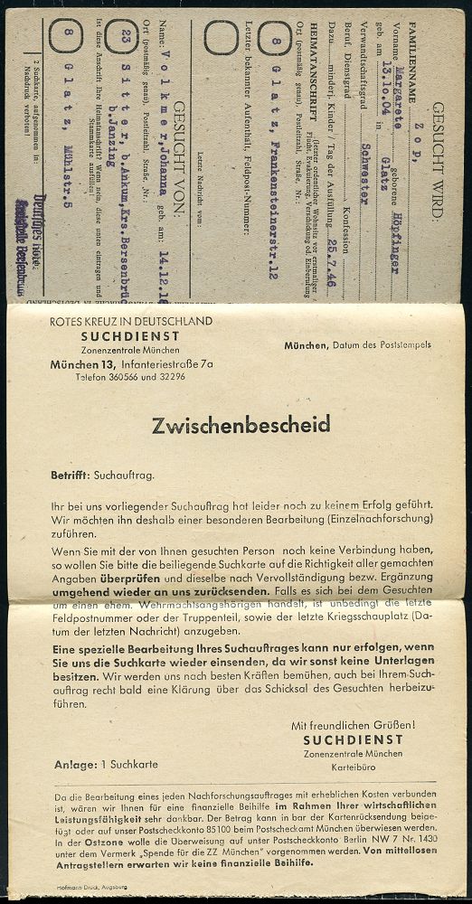 2755 | 25 € | KGF-POST II. WELTKRIEG (ab 1939) : B.R.D. 1949 (ca.) Stalingrad-Vermißtenliste des DRK (Suchdienst München) m. Foto des Vermißten (rs. Hinweise zur Handhabung) selten! (Format A4, Formblatt FJ 381) | ![]() | |