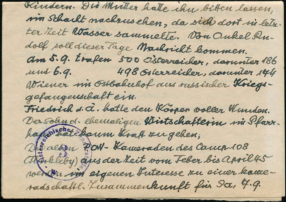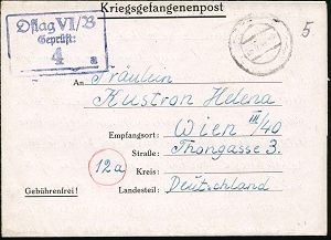 2748 | 18 € | KGF-POST II. WELTKRIEG (ab 1939) : ÖSTERREICH 1946 (10.9.) 1K-Brücke: 1 WIEN 15/2a + viol., sowjet. Zensur-1K: Österreichische Zensurstelle/3/-W. (= Wien, Wo.12 d) + neutraler Steifen, Kgf.-Bf. + Inhalt mit gl. Zensur-1K (Wo.12 d) an brit. P.O.W.-Camp Thirkleby, 2 Belege kompl.! | ![]() ![]() | |