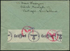 2741 | 18 € | KGF-POST II. WELTKRIEG (ab 1939) : KALISCH/ b 1941 (17.9.) aptierter 2K-Steg (rechts Text entfernt) = Warthegau auf EF 25 Pf. Hindenbg. (Mi.522 EF) rs. OKW-Zensurstreifen "b" + roter 1K. = Berlin (Rie.B-2 a, B-55) frankierter Ausl.-Zensurbf. an I.R.K., Genf | ![]() ![]() | |