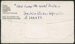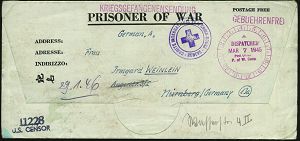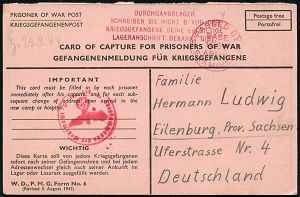 2767 | 18 € | KGF-POST II. WELTKRIEG (ab 1939) : GROSSBRITANNIEN / DUTSCHES REICH 1945 (13.3.) Kgf.-Faltbf.: PRISONER OF WAR POST + viol. 1L: 194 P.W. CAMP + roter brit. Zensur-8eck: PASSED/P 200 (Krone/Wo.4) + viol. 2K: COMITE INT. de la CROIC-ROUGE,, später Kgf.-Beleg! = "stummer" Überroller! (n. Königshain, Zittau) | ![]() ![]() | |