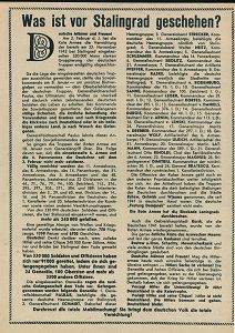 2791 | 35 € | KGF-POST II. WELTKRIEG (ab 1939) : UdSSR / DEUTSCHES REICH 1943 (Febr.) sowjet., deutschsprachige Propaganda-Flugblatt-Zeitung: FRONT-ILLUSTRIERTE Nr.6 = Stalingrad-Kapitulations-Ausgabe , 4 Seiten, innen Portraits von 24 dt. Generälen inkl. Paulus (Format 22 x 29 cm, oben kl. u. gr.Riß) sonst druckfrische Erhaltung, sehr seltene Stalingrad-Ausgabe! | ![]() ![]() | |