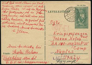 2776 | 25 € | KGF-POST II. WELTKRIEG (ab 1939) : UNGARN 1946 (4.5.) Ausl.-P. 18 f. "Turul", grün, gest. TATAHAZA an Kgf.-Lager AA 108-108/206 PW Camp Neapel, Italien, vs. roter 1L: NOT C 1 + schw. 1L: LAGER 5 NICHT, deutscher Text, seltene Kgf.-Ausl.-Kt. ohne Zensur (Mi.P 112) | ![]() ![]() | |