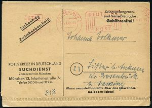 2744 | 35 € | KGF-POST II. WELTKRIEG (ab 1939) : (13b) MÜNCHEN 2/ cd/ DEUTSCHE/ POST 1949 (25.4.) roter Band-PFS o h n e Wertziffer, da portofrei! + viol. 3L: Kriegsgefangenen-/u.Vermißtensache/ Gebührenfrei ! auf Falt-Bf.: ROTES KREUZ.. SUCHDIIENST, Suchantrag Zwischenbescheid mit Inhalt! (Dü.C-7, Nr.161 ohne Wertziffer) | ![]() ![]() | |