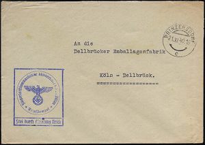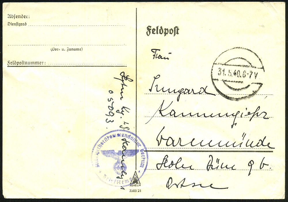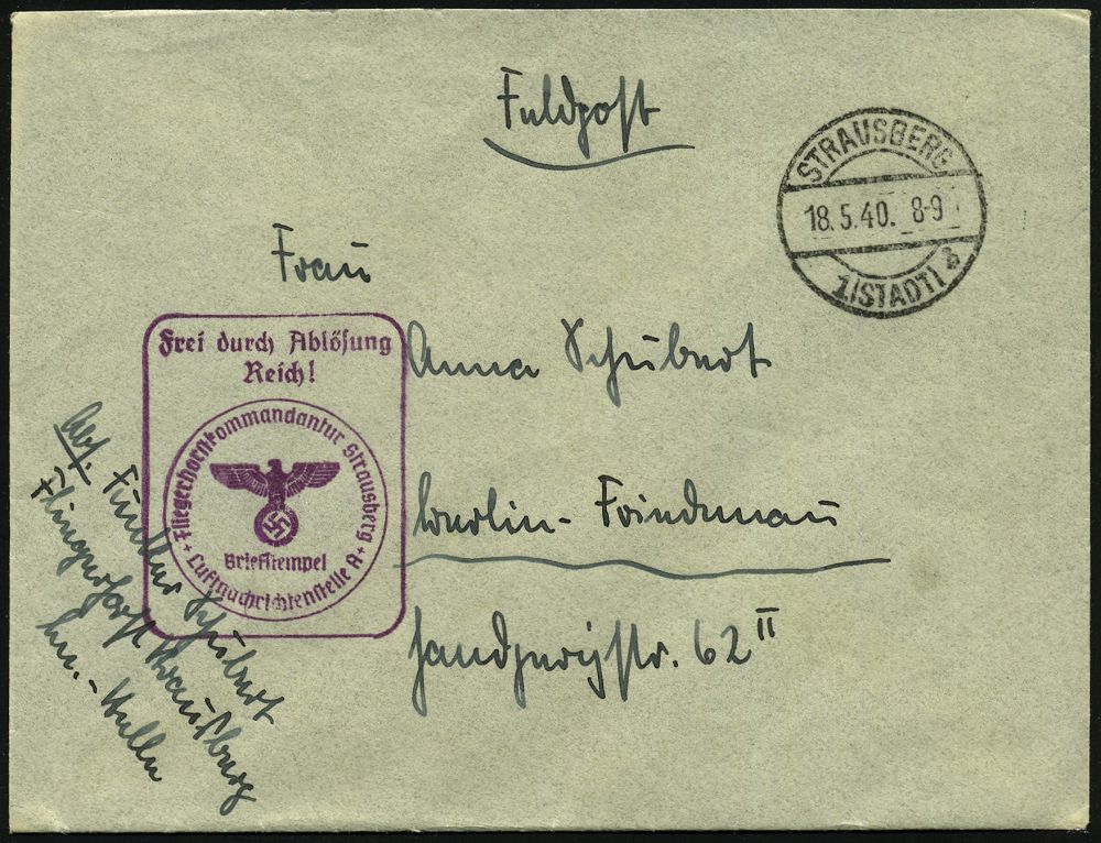 2893 | 14 € | FLIEGERHORST / MILITÄRFLUGHAFEN (1933-45) : STRAUSBERG/ 1(STADT)/ b 1940 (18.5.) 1K-Brücke + viol. Ra.: Frei durch Ablösung/Reich!/ Fliegerhorstkommandantur Strausberg/ Luftnachrichtenstelle + vs. hs. Abs., sehr klar gest. Feldpost-Bf. + Inhalt n. Berlin | ![]() | |