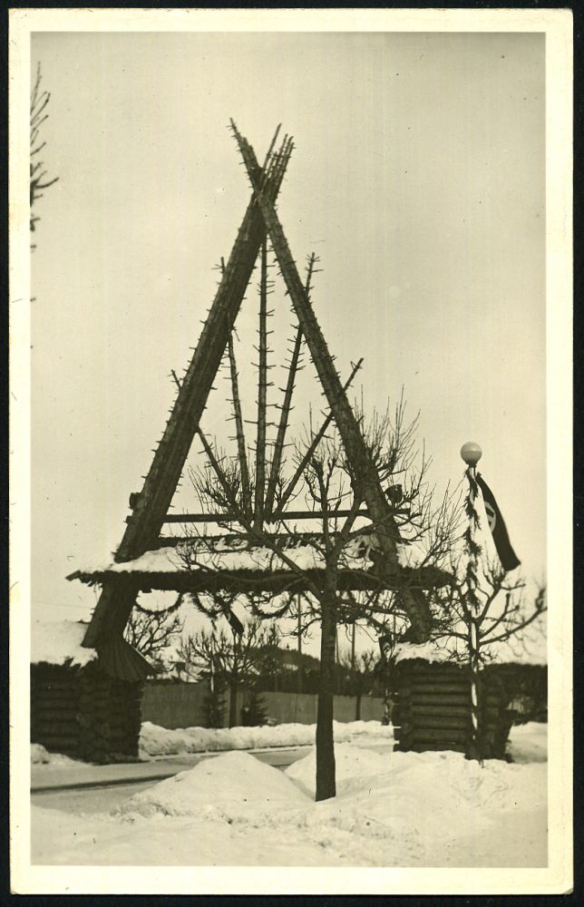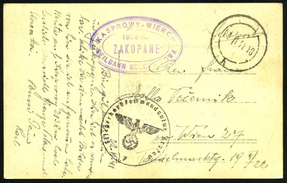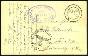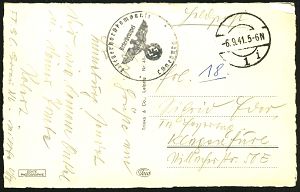 2899 | 25 € | FLIEGERHORST / MILITÄRFLUGHAFEN (1933-45) : GENERALGOUVERNEMENT 1941 (22.6.) stummer, aptierter poln. 2K = Tarnstempel Zakopane (oder Krakau ?) + schw. 1K-HdN: Fliegerhorstkommandantur Krakau/7 + viol. HdN. ZAKOPANE SEILBAHN.. auf s/w.-Foto-Ak.: Zakopane Lagereingang mit Hakenkreuz-Flagge, seltener Beleg! | ![]() ![]() | |