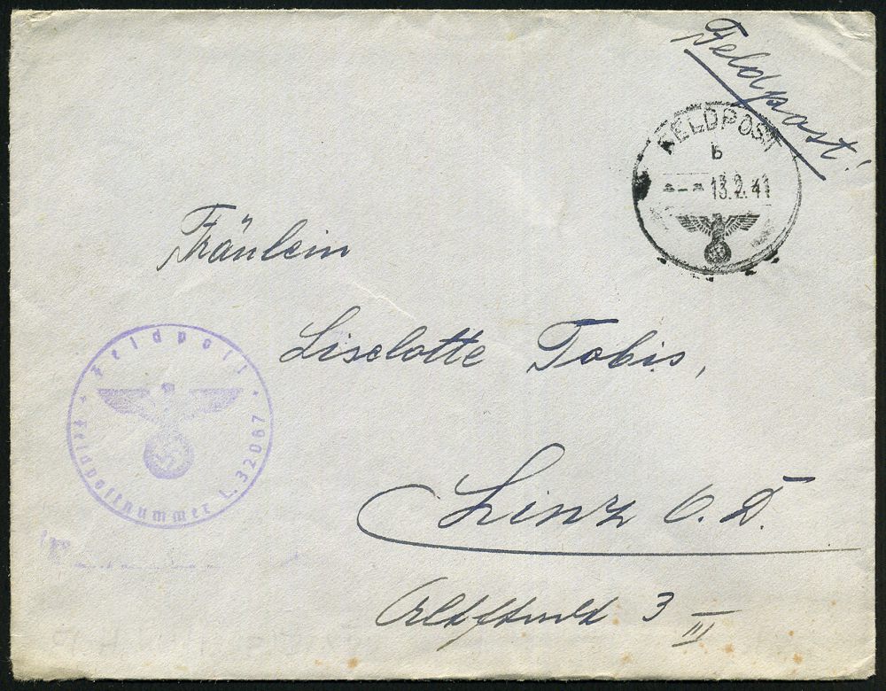 2904 | 15 € | FLIEGERHORST / MILITÄRFLUGHAFEN (1933-45) : DT.BES.FRANKREICH 1941 (13.2.) 1K: FELDPOST/b/--- + viol. 1K-HdN: Feldpostnummer L 32087 = Fliegerhorst Kdtr. (E) 7/XVII , LGPA Paris + rs. hs. Abs., Feldpost-Bf. + Inhalt n. Linz/O.D. | ![]() | |