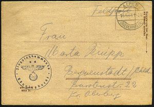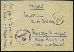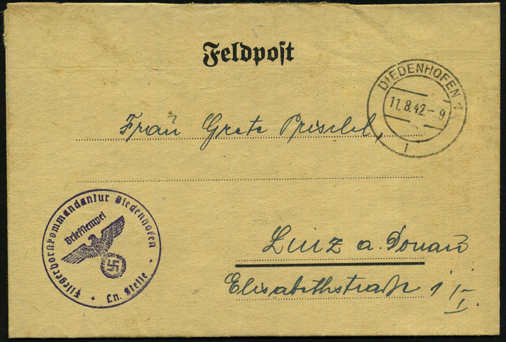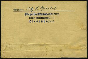 2873 | 16 € | FLIEGERHORST / MILITÄRFLUGHAFEN (1933-45) : DIEDENHOFEN/ i 1942 (11.8.) 2K-Steg (= Thionville) + viol. 1K-HdN: Fliegerhorstkommandantur Diedenhofen/Ln. Stelle + rs. blauer Abs.-3L: Fliegerhorstkommandantur/Nachr. Geräteverwaltung.., klar gest. Feldpost-Faltbf. mit Inhalt n. Linz/Donau | ![]() ![]() | |