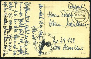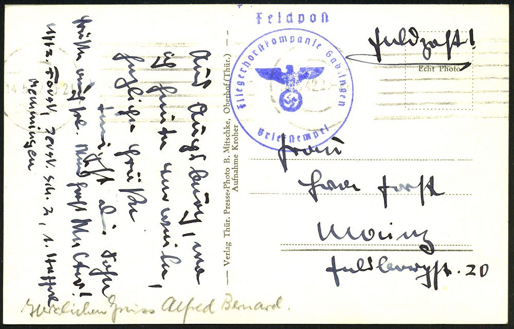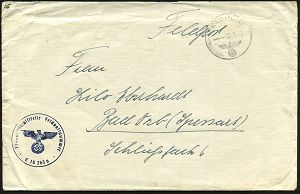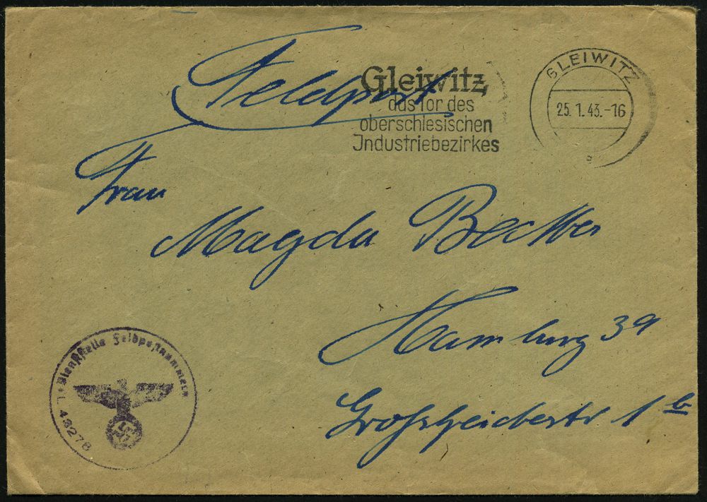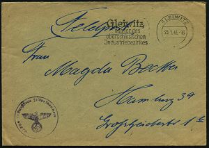 2877 | 16 € | FLIEGERHORST / MILITÄRFLUGHAFEN (1933-45) : GLEIWITZ/ e/ das Tor de/ oberschles./ Jndustriebezirkes 1943 (25.1.) MWSt + viol. 1K-HdN.: Fp. Nr./L 43 278 = Fliegerhorst Kdr. 9/XVII + rs. hs. Abs. (LgpA Breslau) Feldpost-Bf. + Inhalt n. Hamburg (Bo.7 A , Bochmann 1943 unbekannt) | ![]() | |