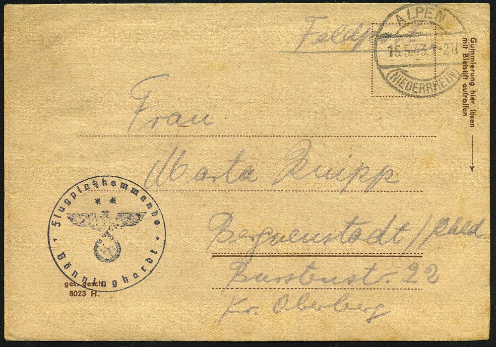 2867 | 14 € | FLIEGERHORST / MILITÄRFLUGHAFEN (1933-45) : ALPEN/ (NIEDERRHEIN) 1943 (15.5.) 1K-Brücke + viol. 1K-HdN: Flugplatzkommando/**/ Bönninghardt , klar gest. Feldpost-Falt-Bf. + Inhalt ! n. Bergneustadt | ![]() | |