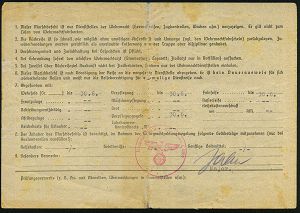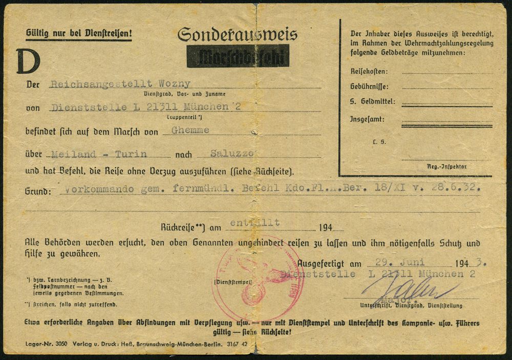 2884 | 18 € | FLIEGERHORST / MILITÄRFLUGHAFEN (1933-45) : München 2 1943 (29.6.) "Sonderausweis" für Dienstreisen der Dienststelle Fp.-Nr. L 21 311 = Fliegerhorst-Kdtr. (E) 36/IV für eine Dienstreise Ghemme - Mailand- Turin - Saluzzo , 2x roter 1K-Hdn (1x undeutl., Mittelbug, teils etw, gestützt) seltenes Dokument | ![]() ![]() | |
