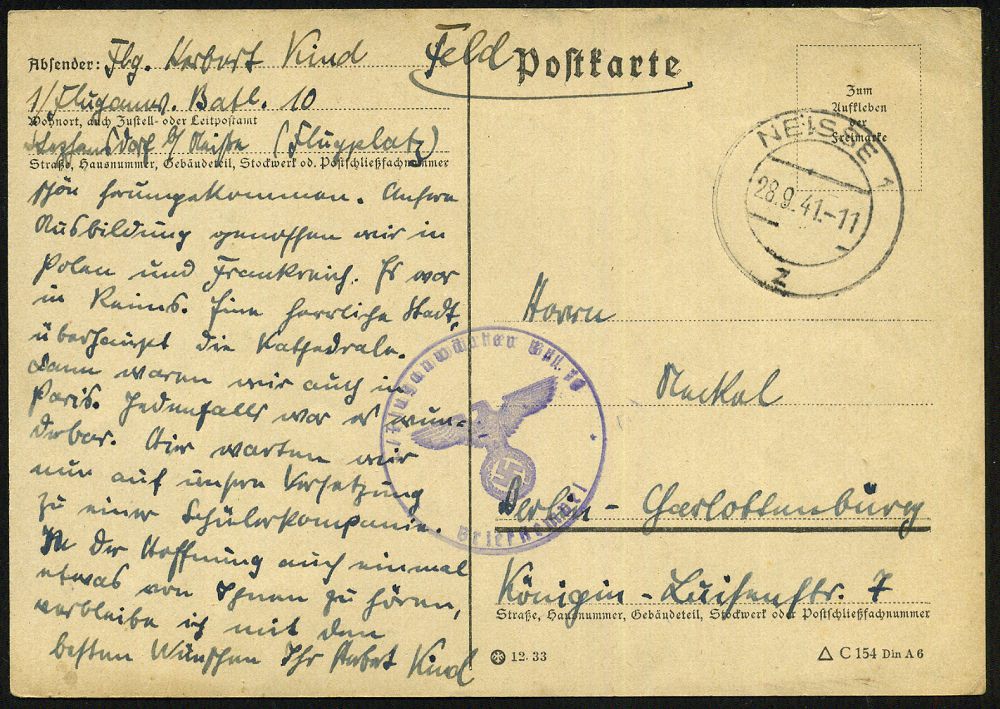 2905 | 16 € | FLIEGERHORST / MILITÄRFLUGHAFEN (1933-45) : DT.BES.FRANKREICH 1941 (27.3.) 1K: FELDPOST/b/--- + blauer 1K-HdN: Truppendienststelle/Komp./F.P. Nr. L 33508/ Luftgaupostamt Paris = Fliegerhorst Kdtr, 12/XII, Frankreich (rs. Abs.: "..Werft") = Fliegerhorst Villacoublay, Feldpostbf. + Inhalt n. Mannheim | ![]() | |