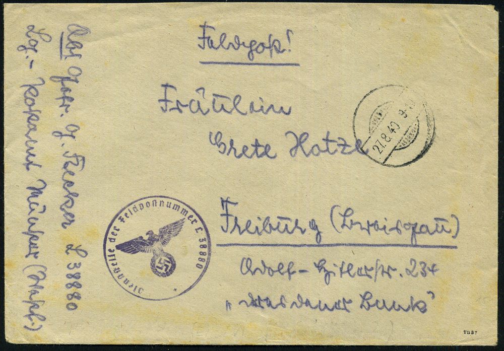 2902 | 15 € | FLIEGERHORST / MILITÄRFLUGHAFEN (1933-45) : DT.BES.FRANKREICH 1940 (27.8.) stummer 1K-Gitter + viol. 1K-HdN: Feldpostnr. L 38 880 = Fliegerhorst Kdtr. (E) 3/VI + hs. Abs.: "..L 38880, Lg.-Postamt Münster (Westf.)" , Juni 1940 bis Apr. 1941 Frankreich, klar gest. Feldpost-Bf. | ![]() | |