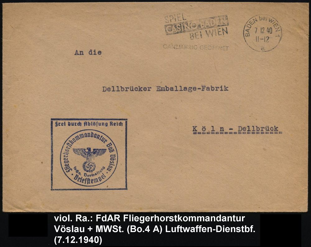 2868 | 15 € | FLIEGERHORST / MILITÄRFLUGHAFEN (1933-45) : BADEN bei WIEN 1/ a/ SPIEL-/ CASINO BADEN.. 1940 (7.12.) MaWSt + viol. Ra.: FdAR/Fliegerhorstkommandantur Bad Vöslau/techn. Verwaltung = "Ostmark", klar auf Luftwaffen-Dienstbf. n. Köln (Bo.4 A) | ![]() | |