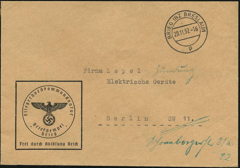 2872 | 18 € | FLIEGERHORST / MILITÄRFLUGHAFEN (1933-45) : BRIEG (BZ BRESLAU)/ p 1937 (29.11.) 2K-Steg auf Luftwaffen-Dienst-Bf.: FdAR/ Fliegerhorstkommandantur klar gest. , nachgesandter Dienstbf. n. Berlin | ![]() | |