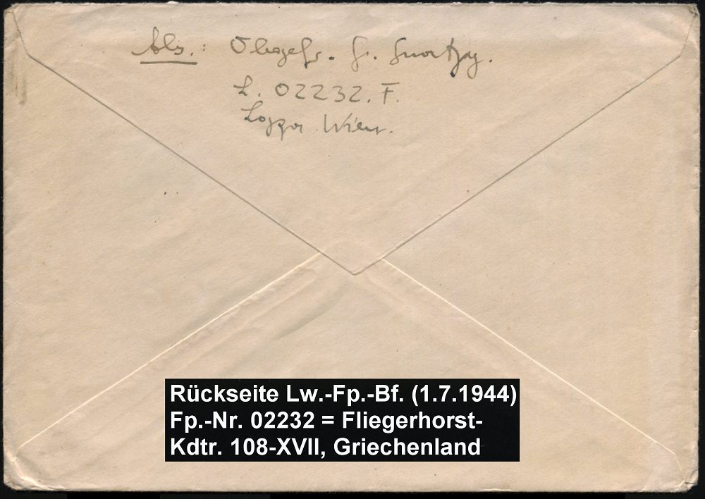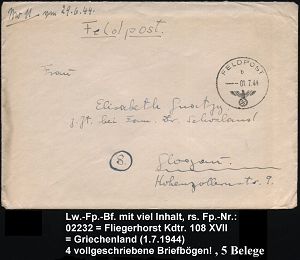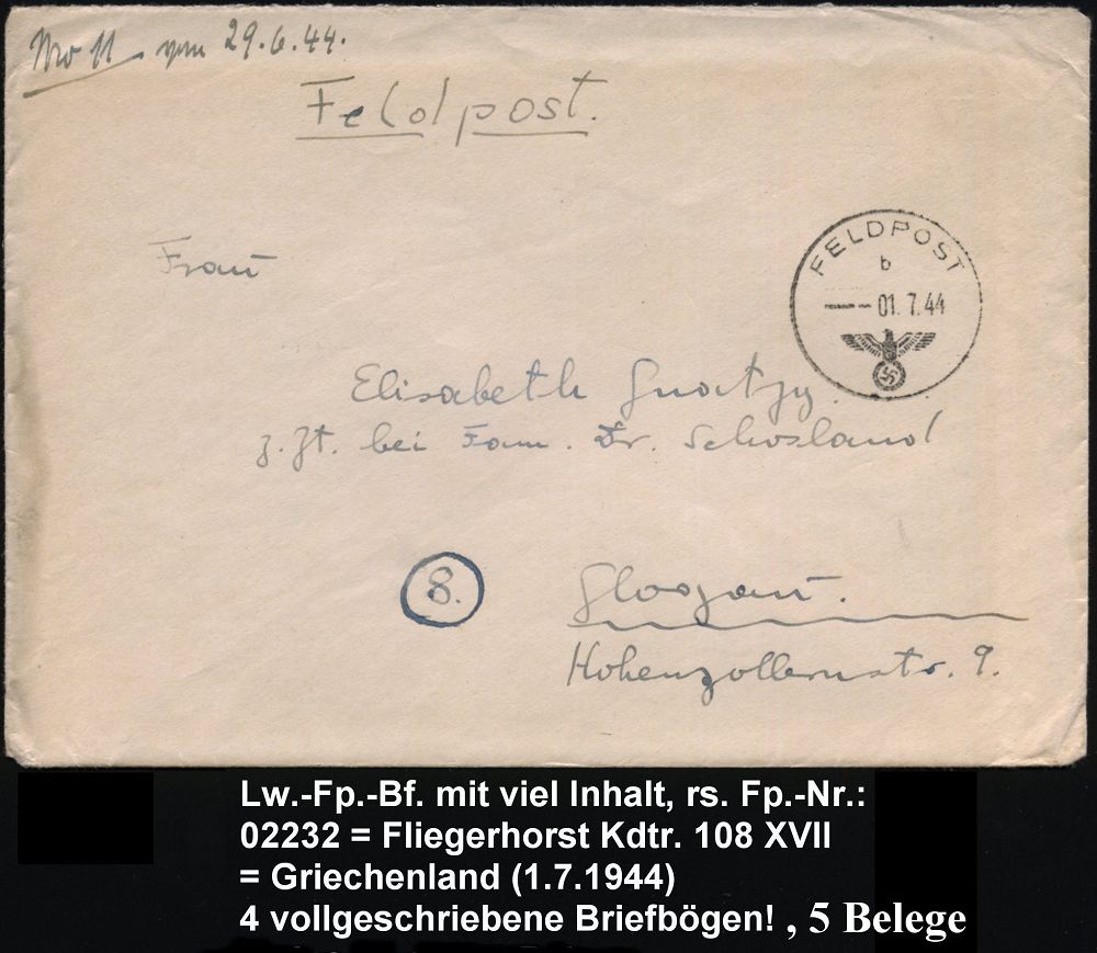 2907 | 18 € | FLIEGERHORST / MILITÄRFLUGHAFEN (1933-45) : DT.BES.GRIECHENLAND 1944 (1.7.) 1K: FELDPOST/b/--- + rs. hs. Abs.: "L 02232 F." = Fliegerhorst-Kdtr. 108 - XVII in Griechen-land , klar gest. Feldpost-Bf. + reicher Inhalt: 4 Briefbögen mit interess. Inhalt (4 Blatt, 8 Seiten) n. Glogau (keine Kopien!) | ![]() ![]() | |