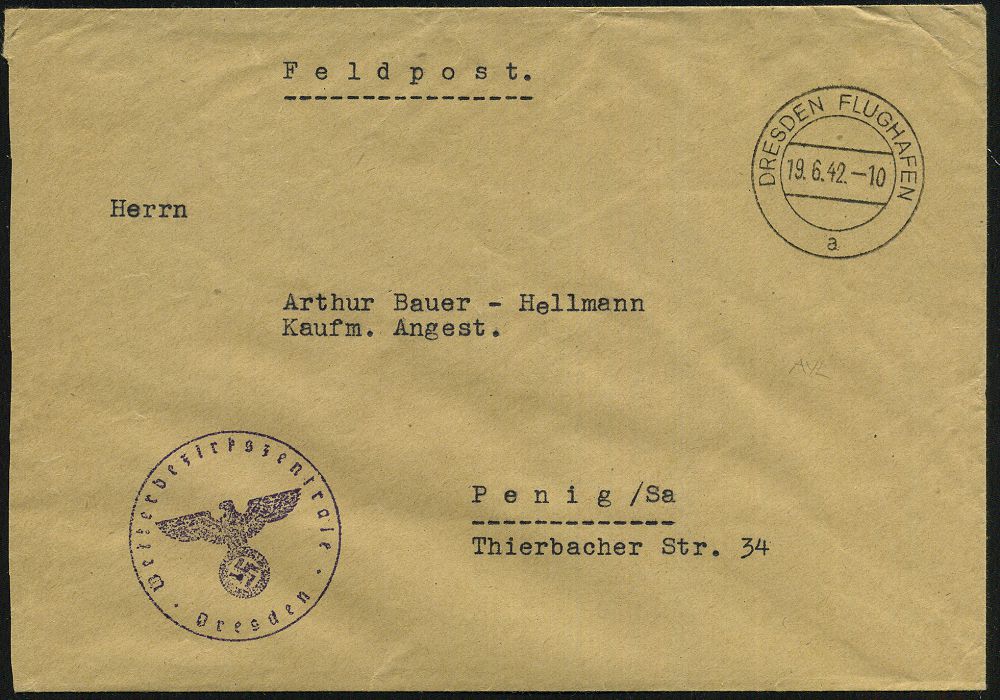 2874 | 18 € | FLIEGERHORST / MILITÄRFLUGHAFEN (1933-45) : DRESDEN FLUGHAFEN/ a 1942 (19.6.) 2K-Steg = Hauspostamt ziviler Flughafen + viol. 1K-HdN: Wehrbezirkszentrale/ Dresden (NS-Adler), klar gest. Feldpost-Bf. n. Penig (Mi.A 15-04) | ![]() | |