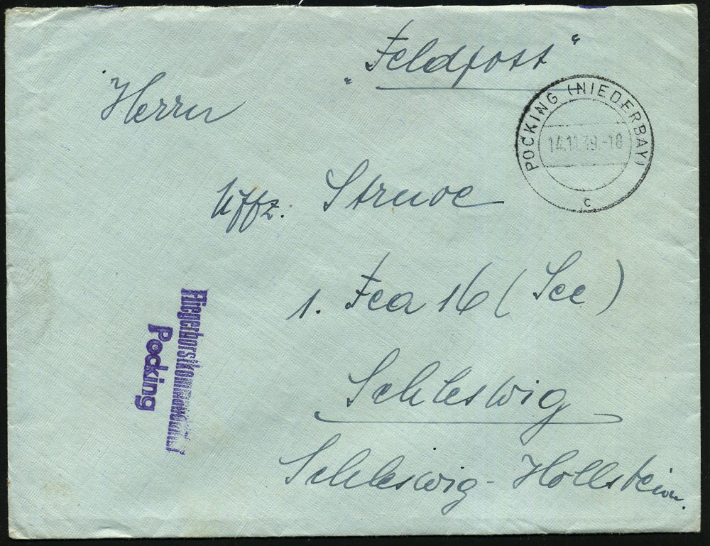 2889 | 12 € | FLIEGERHORST / MILITÄRFLUGHAFEN (1933-45) : POCKING (NIEDERBAY)/ c 1939 (14.11.) 2K-Steg + viol. 2L: Fliegerhorstkommandantur/ Pocking + rs. hs. Abs., Feldpost-Bf. + Inhalt n. Schleswig | ![]() | |