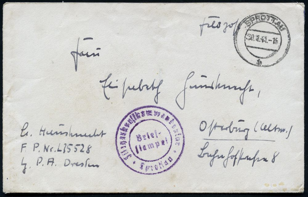 2892 | 15 € | FLIEGERHORST / MILITÄRFLUGHAFEN (1933-45) : SPROTTAU/ b 1941 (30.1.) 2K-Steg + viol., provis. 2K-HdN: Fliegerhorstkommando/ Sprottau + hs. Abs.: ".. F.P. Nr. L 35528, Lg. P. A.", Feldpost-Bf. n. Osterburg | ![]() | |