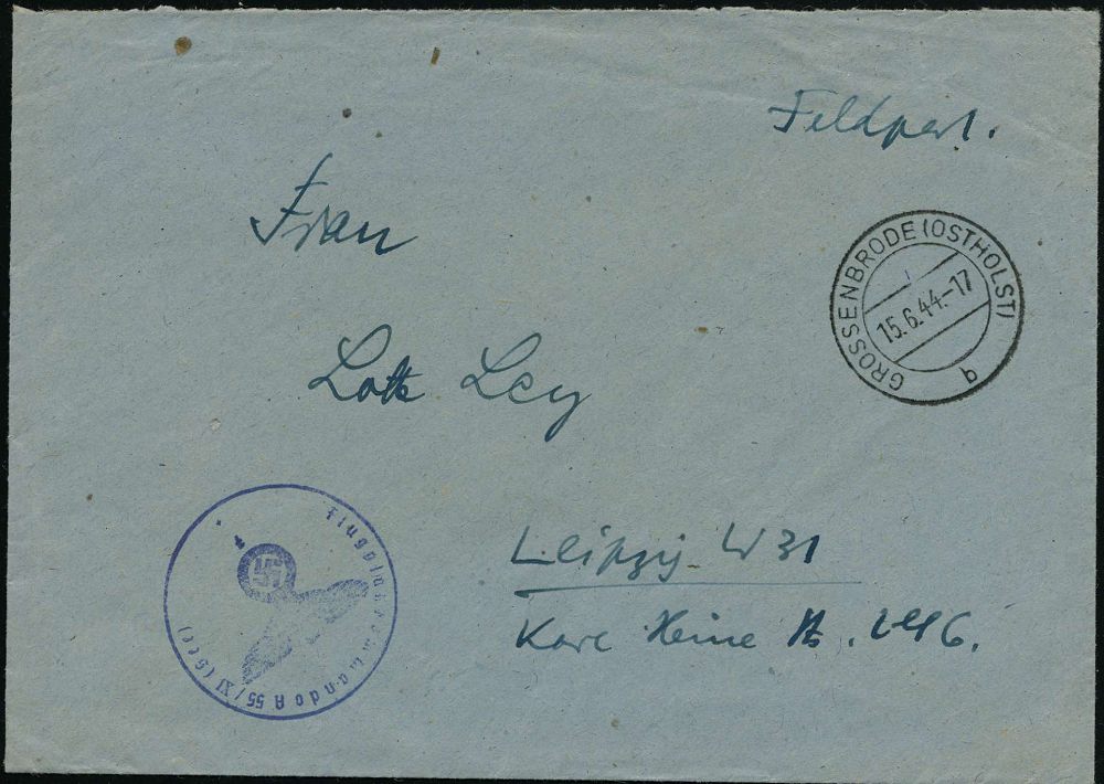 2878 | 15 € | FLIEGERHORST / MILITÄRFLUGHAFEN (1933-45) : GROSSENBRODE (OSTHOLST)/ b 1944 (15.6.) 2K-Steg + viol. HdN: Fliegerhorstkommando A 55- XI (See) , rs Abs.-3L: Truppenzahnarzt/ beim Flugplatzkommando.. klar gest. Feldpost-Bf. n. Leipzig | ![]() | |