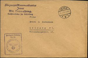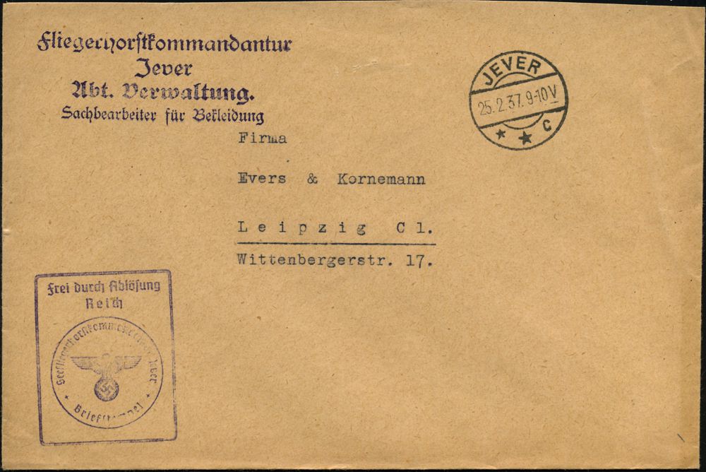 2881 | 15 € | FLIEGERHORST / MILITÄRFLUGHAFEN (1933-45) : JEVER/ **c 1937 (25.2.) 1K-Brücke + viol. Ra.: FdA/R/Fliegerhorstkommandantur Jever (NS-Adler) + viol. 4L: Fliegerhorst-kommandantur/ Jever/..Bekleidung, dekorativer , klar gest. Wehrmachts-Dienstbf. n. Leipzig | ![]() | |