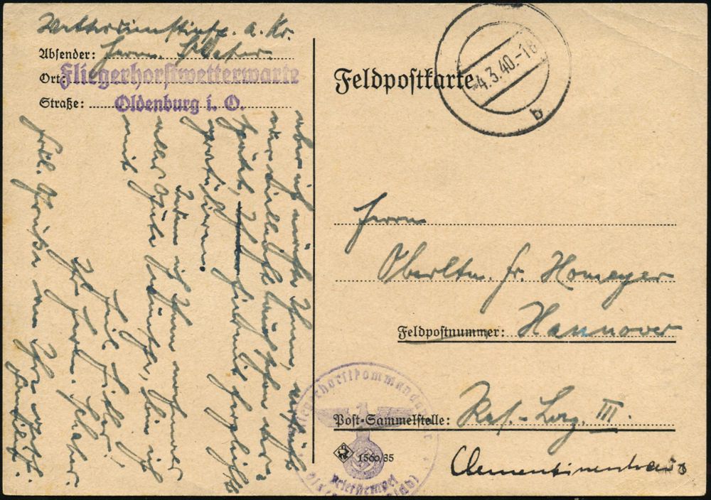 2887 | 16 € | FLIEGERHORST / MILITÄRFLUGHAFEN (1933-45) : Oldenburg/ Oldbg. 1940 (4.3.) stummer 2K-Steg = Tanstempel Oldenburg+ viol. Abs.-2L: Fliegerhorstwetterwarte/ Oldenburg i.O. + viol. 1K-HdN: Fliegerhorstkommandantur.. (unten nicht voll) klar gest. Feldpost-Kt. n.Hannover | ![]() | |