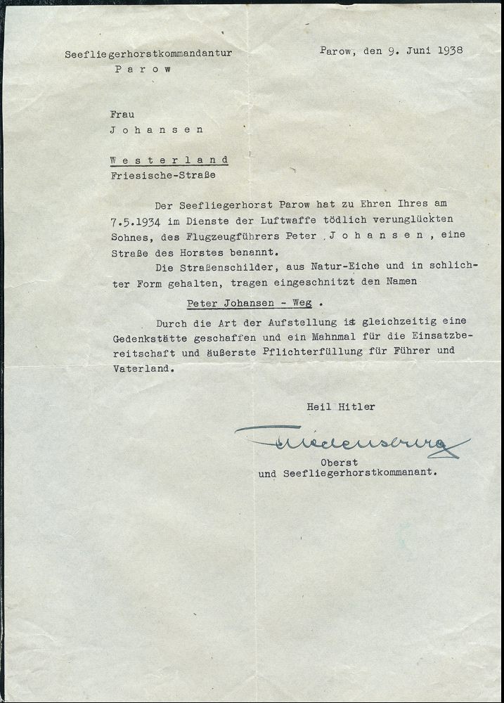 2888 | 25 € | FLIEGERHORST / MILITÄRFLUGHAFEN (1933-45) : Parow 1938 (9.6.) Briefbogen "Seefliegerhorst Parow" betr. Bennenung einer Straße nach einem tödlich verunglückten Flieger , orig. Signatur des Kommandanten Oberst "Friedensburg" (Format DIN-A4) | ![]() | |