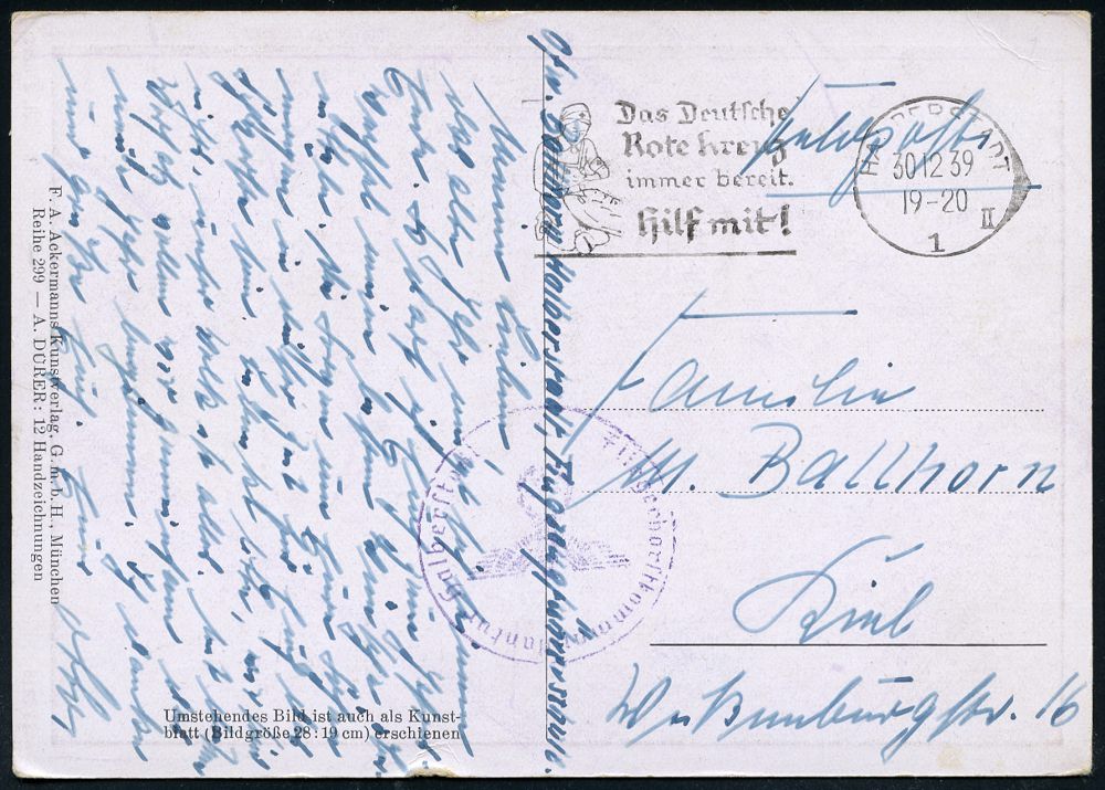 2879 | 15 € | FLIEGERHORST / MILITÄRFLUGHAFEN (1933-45) : HALBERSTADT/ 1 II/ Das Deutsche/ Rote Kreuz/ immer bereit./ Hilf mit! 1939 (30.12.) Serien-MaWSt (RK-Kranken-schwester) + viol. 1K-HdN: Fliegerhorstkommandantur Halberstadt , Feldpost-Künstler-Ak.: Dürers "Betende Hände" n. Kiel | ![]() | |