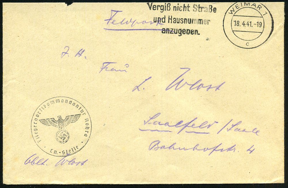 2896 | 15 € | FLIEGERHORST / MILITÄRFLUGHAFEN (1933-45) : Weimar-Nohra 1941 (18.4.) Serien-MWSt: WEIMAR 1/c/Vergiß nicht Straße/u.Hausnummer/anzugeben. (Bo.S 70 A) + schw. 1K-HdN: Fliegerhorstkommandantur Nohra/ Ln.-Stelle, klar gest. Feldpostbf. (oben etw, knapp geöffnet) n. Saalfeld | ![]() | |