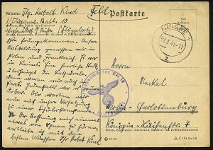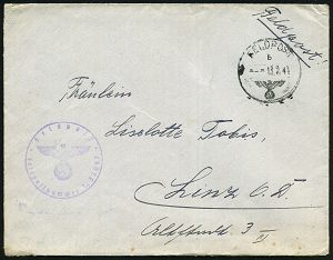 2894 | 16 € | FLIEGERHORST / MILITÄRFLUGHAFEN (1933-45) : Suwalki 1941 (28.5.) abgeschliffene, stumme 1K-Brücke = Tarnstempel (nur Datumsbrücke) + viol. 1K-Hdn: Feldpostnummer L 37571/ Luftgaupostamt Posen = Fliegerhorst Kdtr. (E) 29/XII (Sept. 1940 - Juli 1941) Suwalki + hs. Abs., Feldpost-Kt. (schwach fleckig) an Fp.-Nr. L 29 129, Lgpa. Hamburg = Fliegerhorst Kdtr. (E) 34/XI | ![]() | |