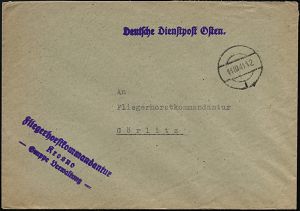 2898 | 18 € | FLIEGERHORST / MILITÄRFLUGHAFEN (1933-45) : GENERALGOUVERNEMENT 1941 (11.3.) stumme 1K-Brücke = Tarnstempel Krosno + viol. 3L: Fliegerhorstkommandantur/ Krosno/ Gruppe Verwaltung + viol. 1L: Deutsche Dienstpost Osten, Dienstbf. an Fliegerhorst Görlitz | ![]() | |