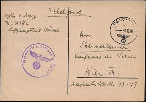 2901 | 15 € | FLIEGERHORST / MILITÄRFLUGHAFEN (1933-45) : DT.BES.BELGIEN 1940 (30.10.) 1K: FELDPOST/b/--- + viol. 1K-HdN: Fp. Nr. 30 182 = Fliegerhorst Kdtr. 6/XVII (Lg.-PA Brüssel) klar gest. Feldpost-Kt. n.Wien | ![]() | |