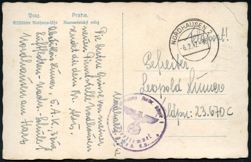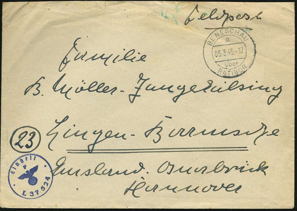 2914 | 30 € | II. WELTKRIEG: LUFTWAFFEN-EINHEITEN / LUFTFELDPOST 1939-45 : BENESCHAU/ a/ über/ RATIBOR 1945 (5.3.) 2K-Steg = PSt. I + kleiner, viol. 1K-HdN: Einheit/F/L 37 524 = Fliegerhorst-Kommandantur , rs. hs. Fp.-Nr. "Lp Nr L 54 283, Dresden", klar gest., später Feldpost-Bf. n. Lingen, die Rote Armee besetzte Ratibor am 31.3.1945 | ![]() | |